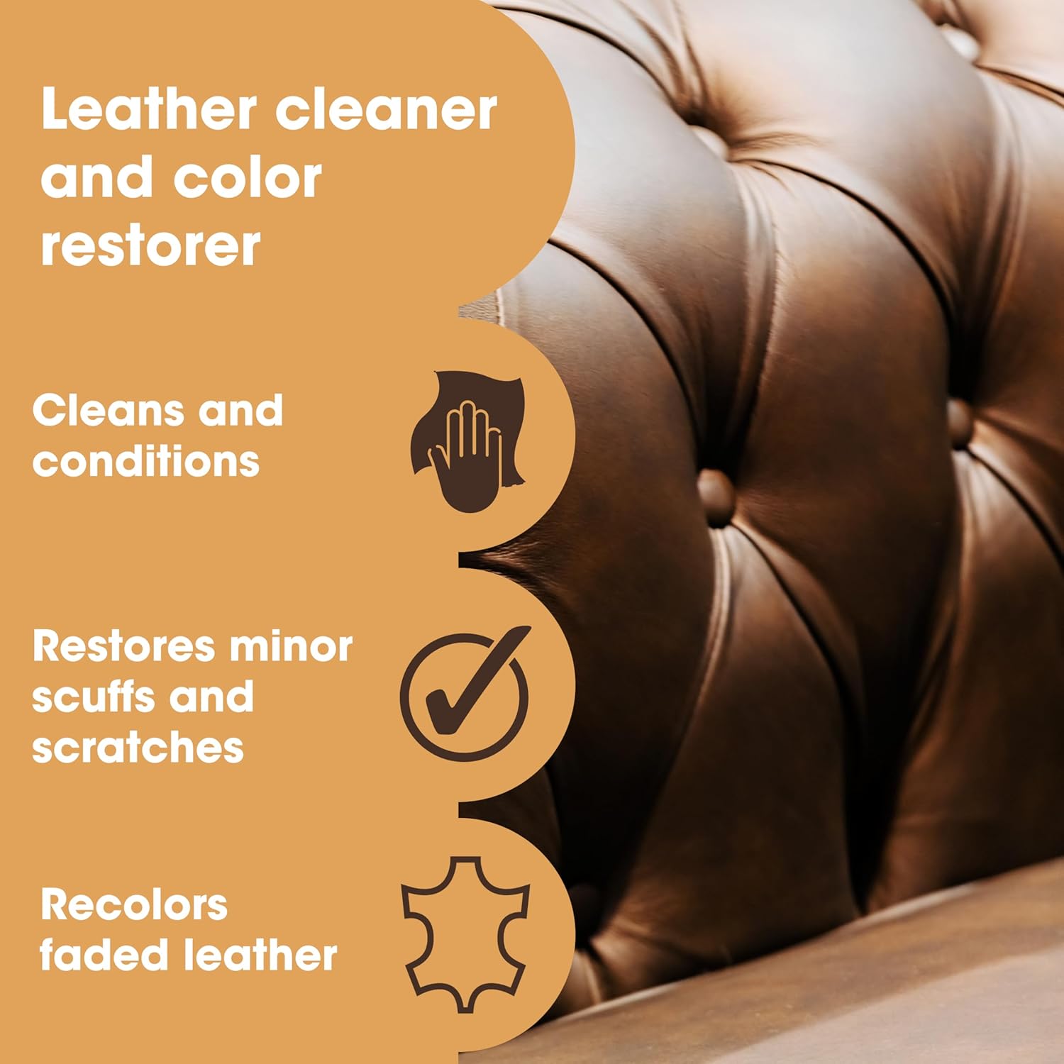 - LEATHER CLEANER: Leather Cleaner, our highly-rated leather cleaning product, removes the dirt and grime that are deeply ingrained in your leather. An essential component of this two-part kit, Leather Cleaner for furniture and other leather surfaces ensures that your leather is clean, stain-free, and ready for the second half of our efficient two-step process: our Leather Re-Coloring Balm.
