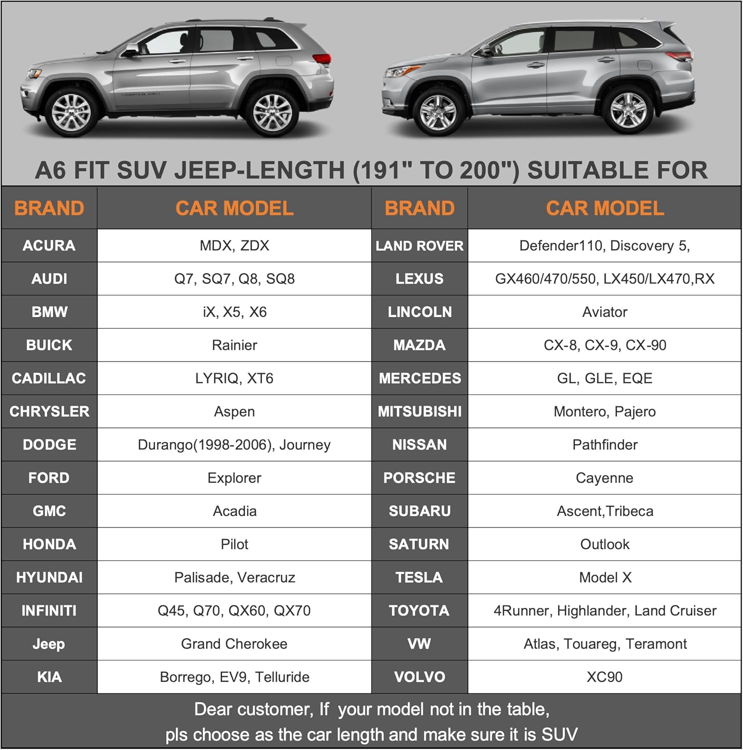 - ăDimension A6ăUniversal fit for Suv which length is 191-201 inch (Not for hatchback and sedan). Suitable for Ford Explorer, Toyota Highlander/Land Cruiser, Honda pilot, Acura MDX/ZDX, Cadillac XT6, Lexus RX/LX, Infiniti FX/QX60/70, Kia Telluride, Hyundai Palisade/Veracruz, Nissan Pathfinder, Porsche Cayenne, Audi Q7/Q8, BMW X5/X6, Volkswagen Atlas/Touareg, Tesla Model X etc.
