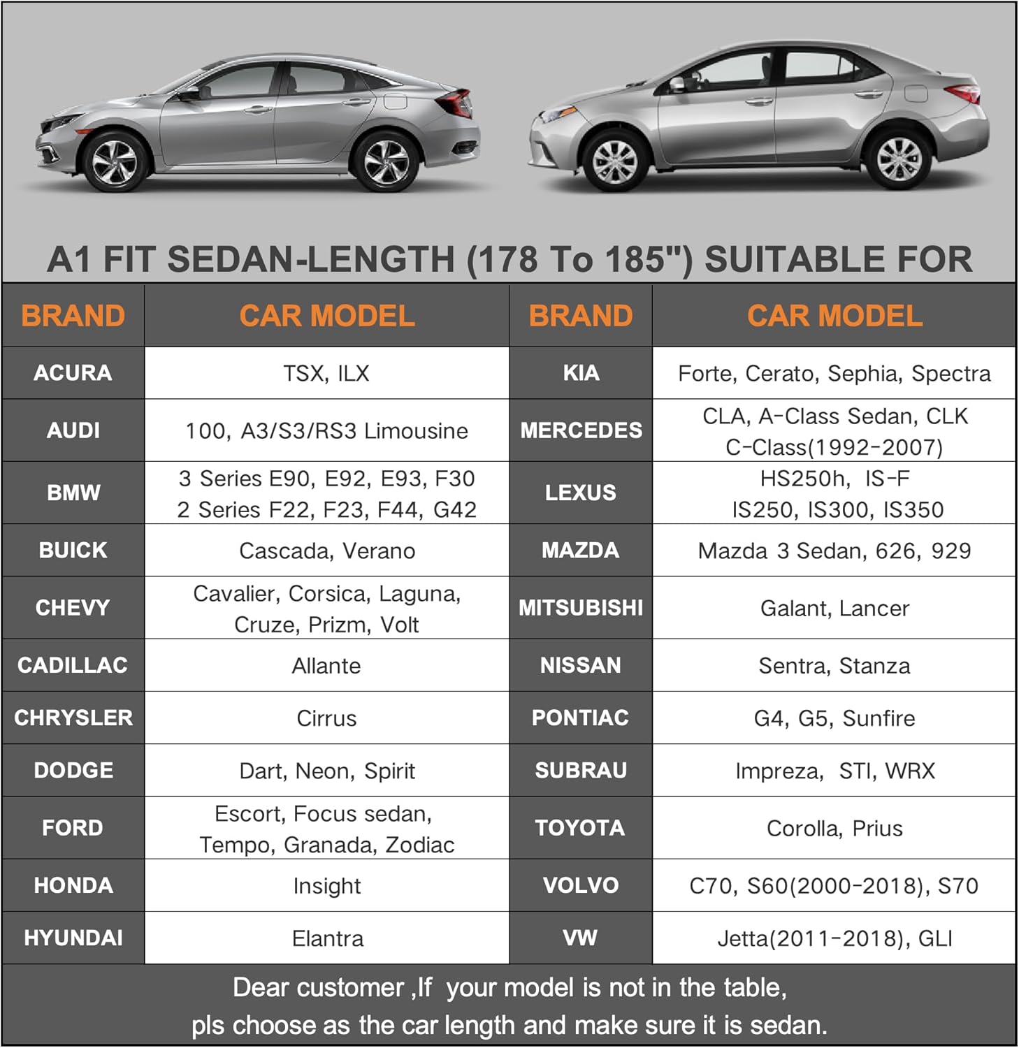 - ăDimension A1ăUniversal fit for sedan which length is 178 to185 inch (NOT FOR HATCHBACK AND SUV ). Suitable for Nissan Sentra, Toyota Corolla/ Prius, BMW 3 Series, Ford Focus Sedan,Hyundai Elantra, Kia Forte/Cerato, Lexus IS250/300/350, Mitsubishi Lancer, Subaru Impreza/wrx, VW Jetta etc.