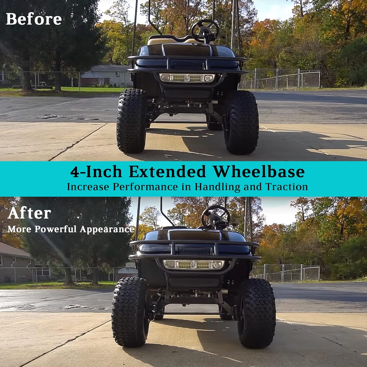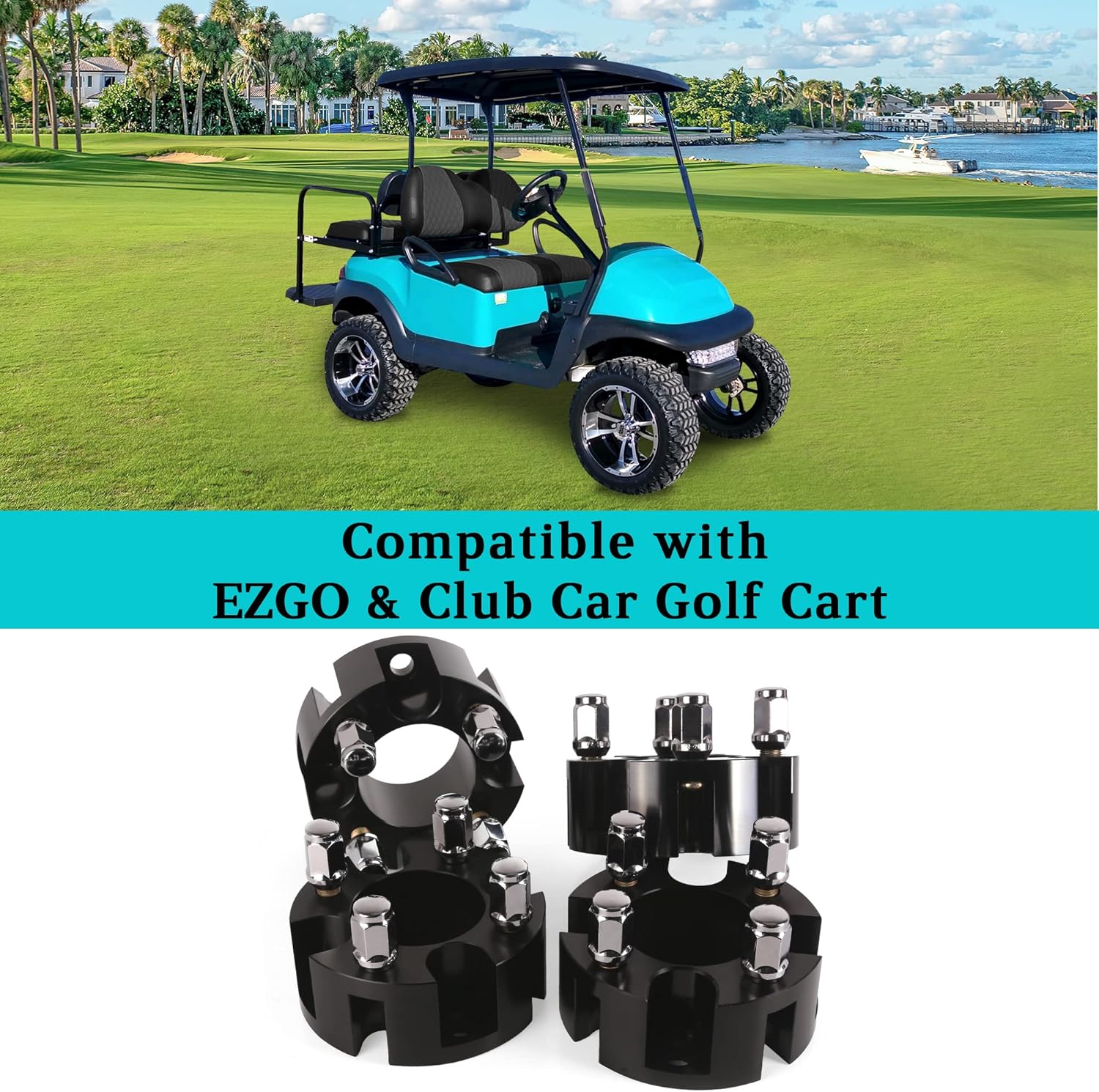 - 2 inch wheel spacers for EZGO, Club Car & Yamaha golf carts with 4ร4 bolt pattern and 1/2-20" studs which are heat-treated and hardened for resisting corrosion and rust.