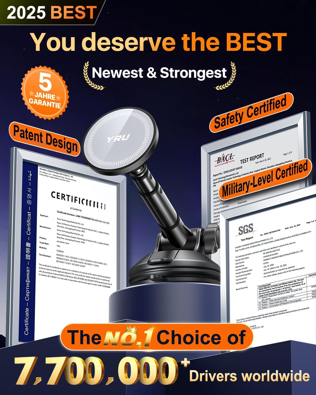 - [2025 Grandmaster Design, Certificated Structure] It's YRU star work among 100+ Dashboard car phone holders design since 2010, which covers originally safety & convenience & elegance. Industry-only made of solid aluminum alloy and KING of the super magnets "NdFeB". The convinced structure is certified by RoHS and CP65