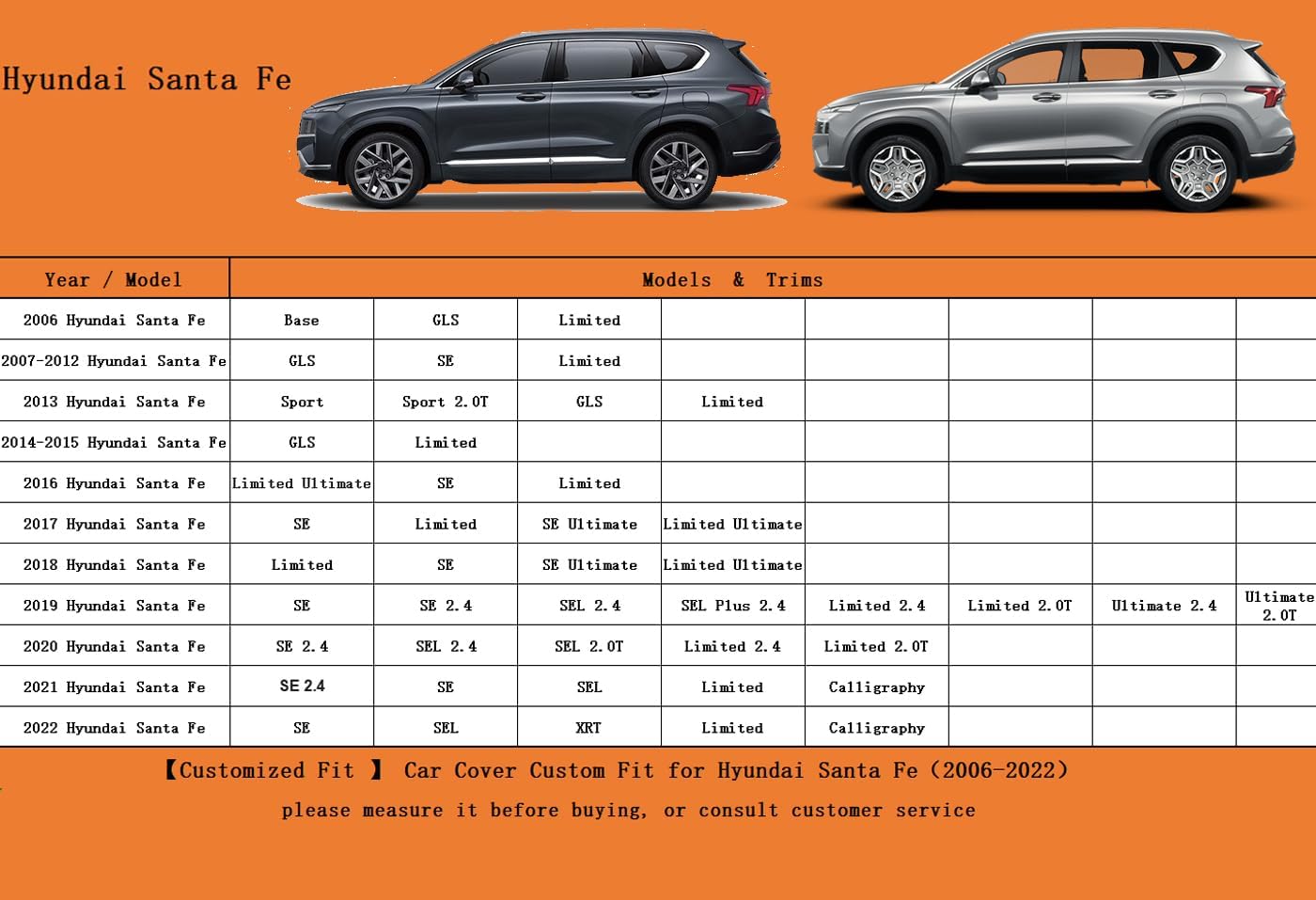 - ăSuitable forăâ Custom fit for Hyundai Santa Fe (2006-2025). Come with a large enough portable bag to store your cover when you do not use
