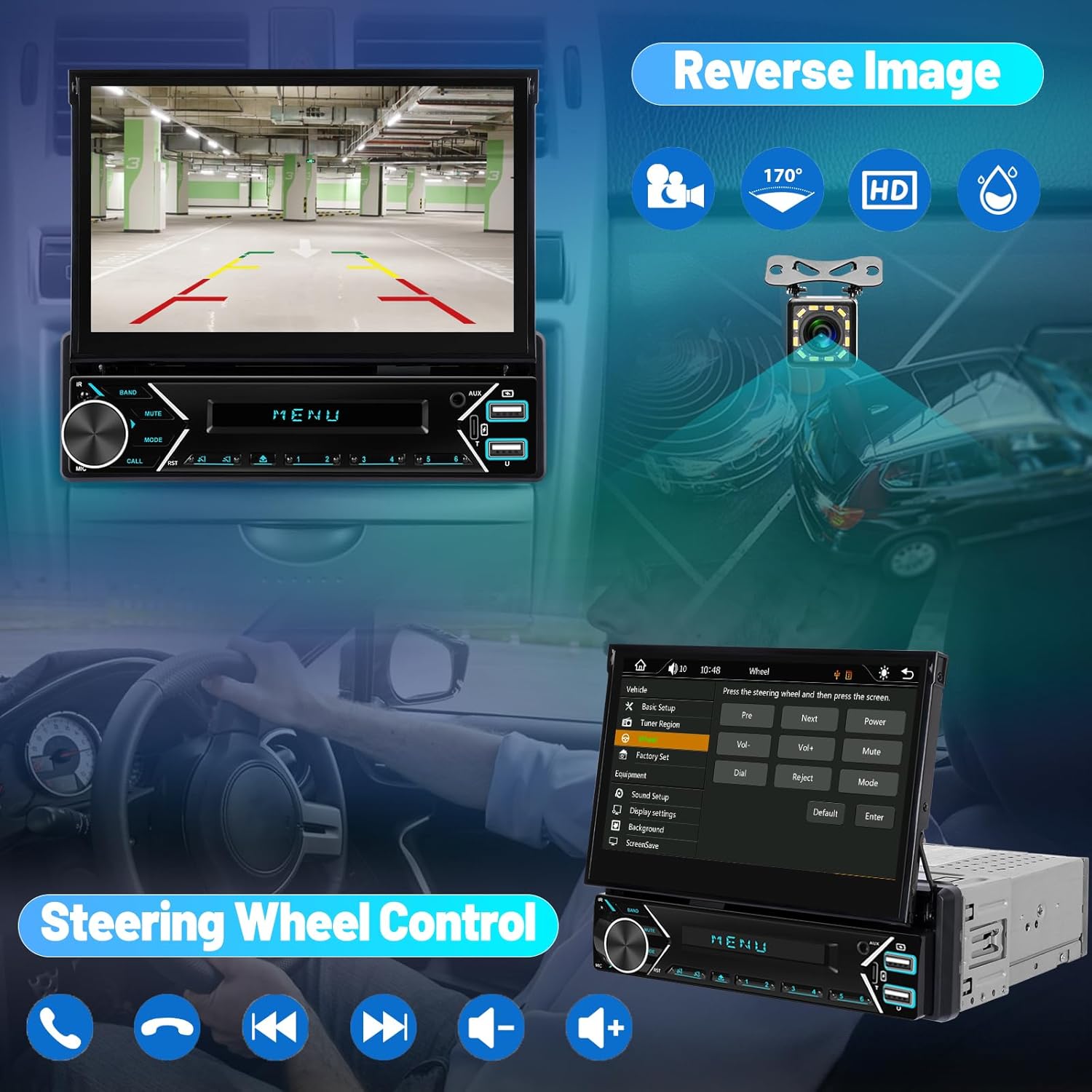 - 12 LED Backup Camera & SWC: Equipped with a 12LED backup camera, and the 7 inch mirror link car stereo screen will automatically switches to the clear reversing image when reversing; Supports steering wheel control function, the drivers can quickly switch songs or adjust volume through the steering wheel for more, which is more and more convenient.