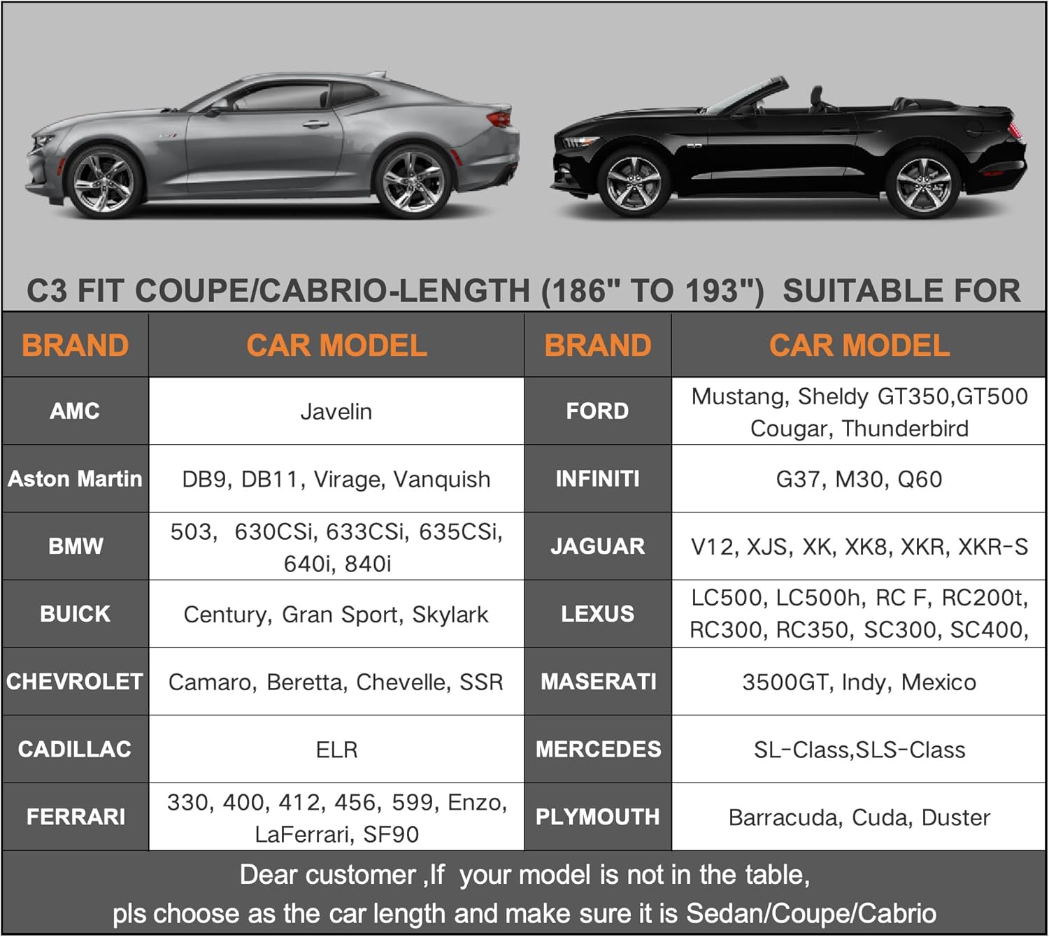 - ăDimension C3ăUniversal fit for Coupe/Sedan/Cabriolet which length is 186-193 inch (Not for hatchback and SUV ). Suitable for Ford Mustang,Shelby, Chevy Camaro, Jaguar XK, XKR,Etc.