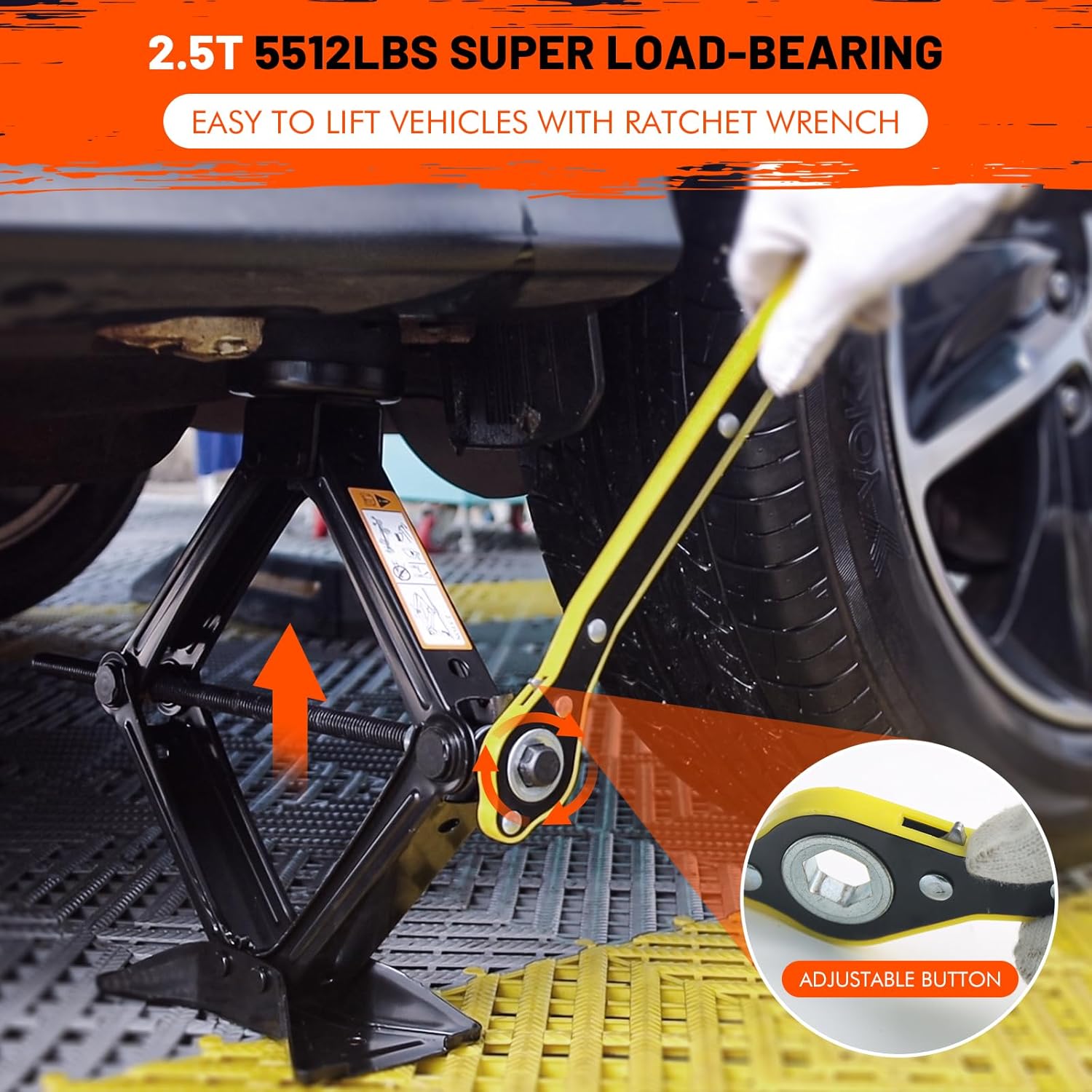 - 【Complete Tire Changing Kit】2.5T Scissor jack x 1; Rubber Pad x 2 ; Ratchet Wrenchx 1; Lug Wrench(17/19mm 21/23mm) x 1; Gloves x 1; Storage Bag x 1. all-inclusive Tools fit perfectly in your trunk or garage, ready to tackle any emergency tire replacement job.