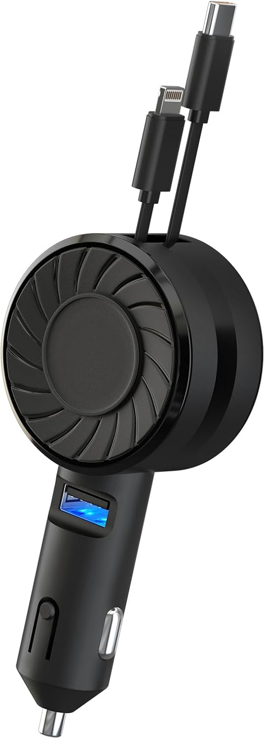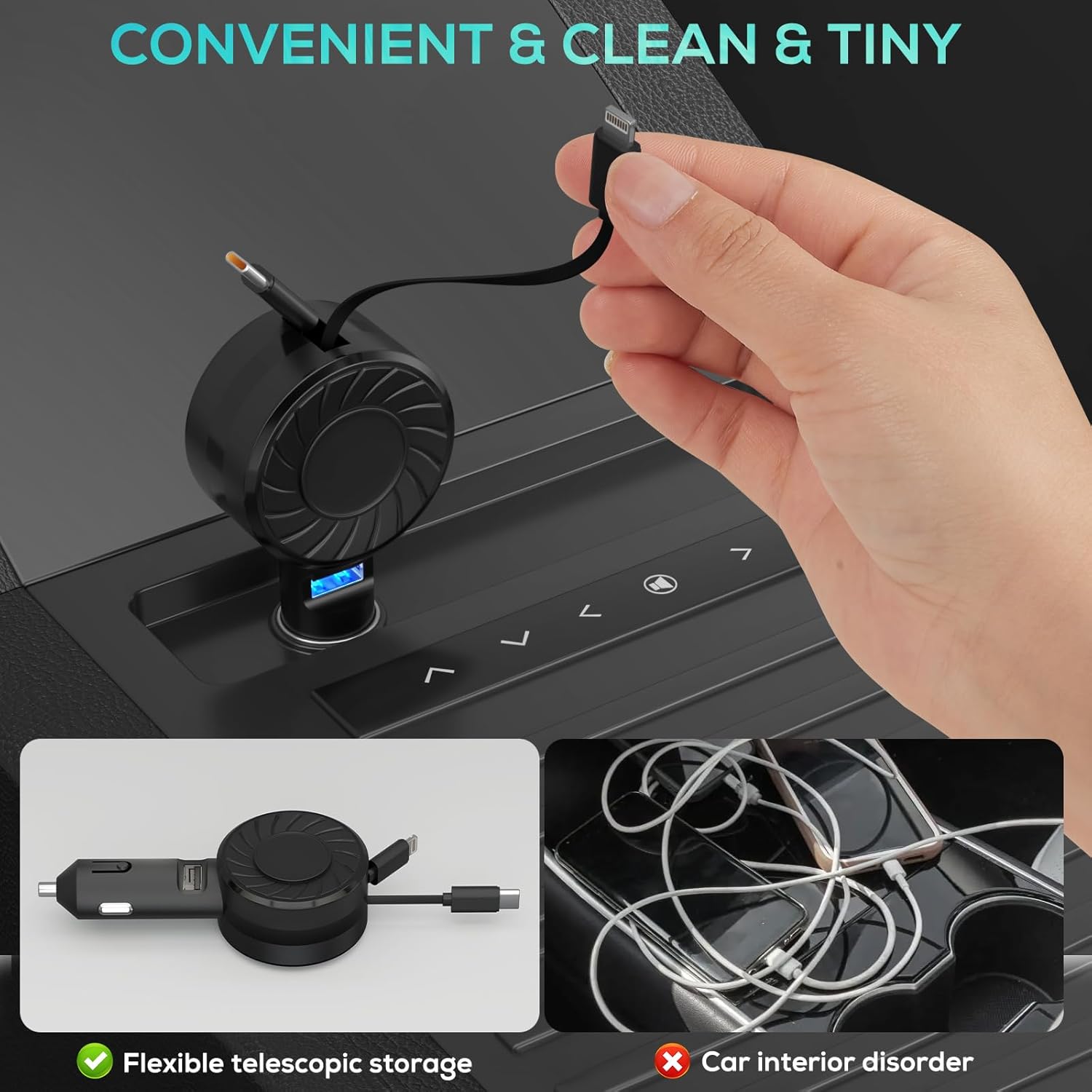 - Retractable Charging Cord : 2 pieces retractable cords(one is lighting cable and another is USB-C cable) support more convenience for charging in the car. The long cable allows you charge the device in any seats meanwhile use the phone free. The cable retracts smoothly and automatically, it offers effortless storage. When in use, simply pull out the cable until you hear a βclickβ for secure fixing, making charging a breeze. When not in use, a gentle tug retracts the cable automatically, keeping space neat and tidy.