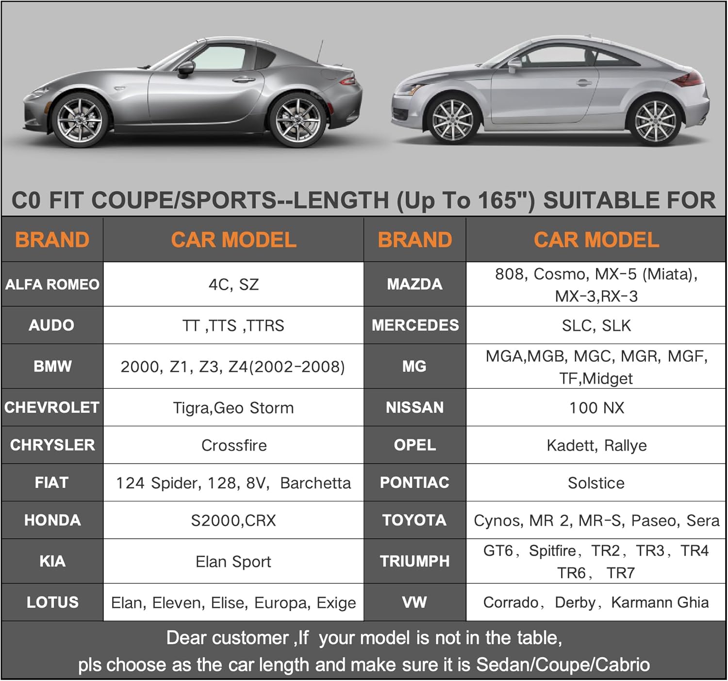 - ăDimension C0ăUniversal fit for Sedan Coupe Sports Car which length is up to 165 inch. (NOT FOR HATCHBACK/SUV). Such as Mazda Miata Mx-5, Honda S2000,Toyota mr2 Spyder BMW Z3 etc. Come with a large enough and waterproof portable storage pocket to store the cover.