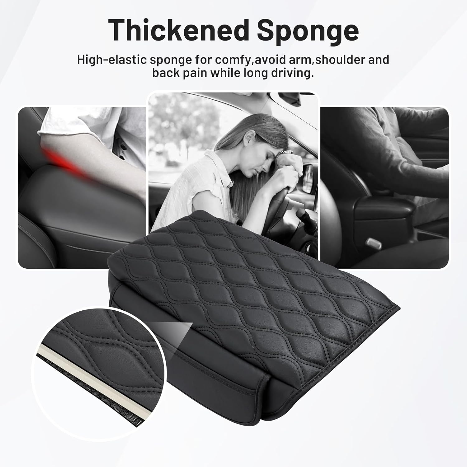 - Simple Installation---This car arm rest padded cushion features elastic bands for a snug fit, preventing it from wobbling. The back is covered with raised dots to keep the center console cover in place. Simply open the armrest box, slide the elastic band into the cover, and close it up.