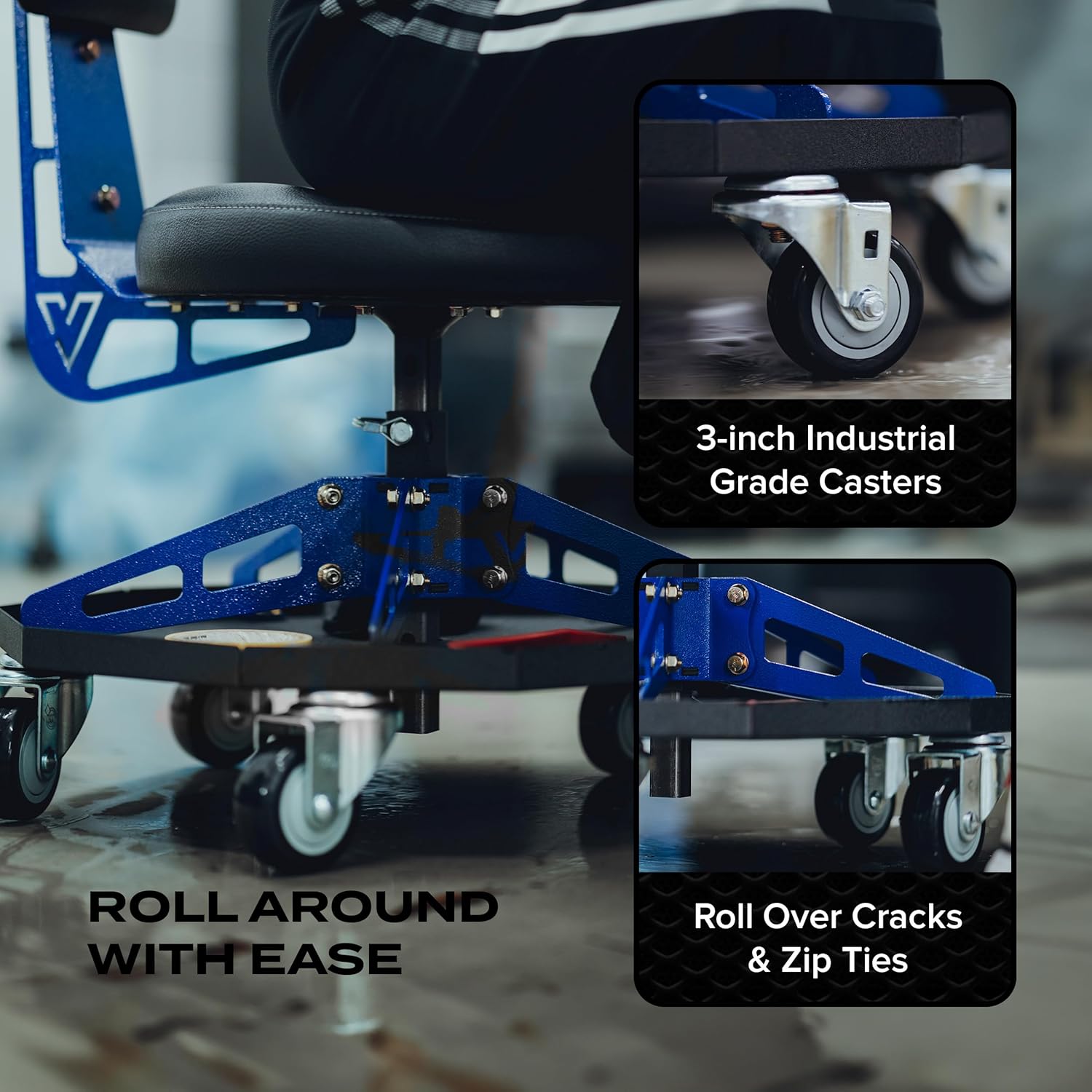 - Hassle-free mobility – With a 300 lb weight capacity, robust steel frame, and large 3" industrial-grade casters, this shop stool effortlessly glides over various surfaces and prevents tipping.