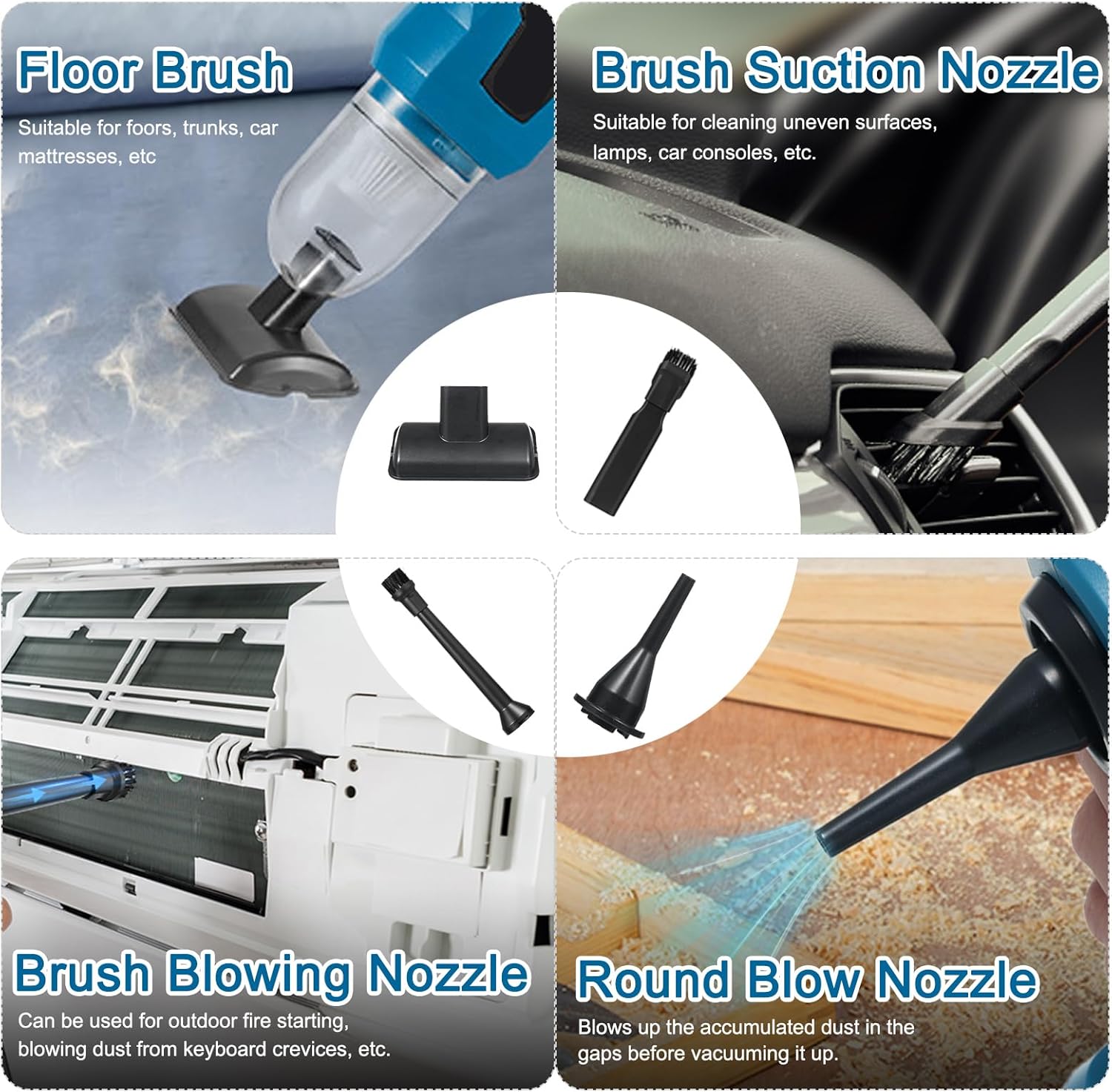 - ăPacking ListăCar vacuum*1, Rechargeable battery*1, Filter*2, Charging cable*1, 1 * User Manual. [Vacuum Accessories]:Floor brush*1,Flat suction brush*1,Long flat suction*1,[Blowing and Inflating Accessories]:Short blowing nozzle*1,Pipe blowing round brush*1,Long blowing pipe*1, Inozzle*1.