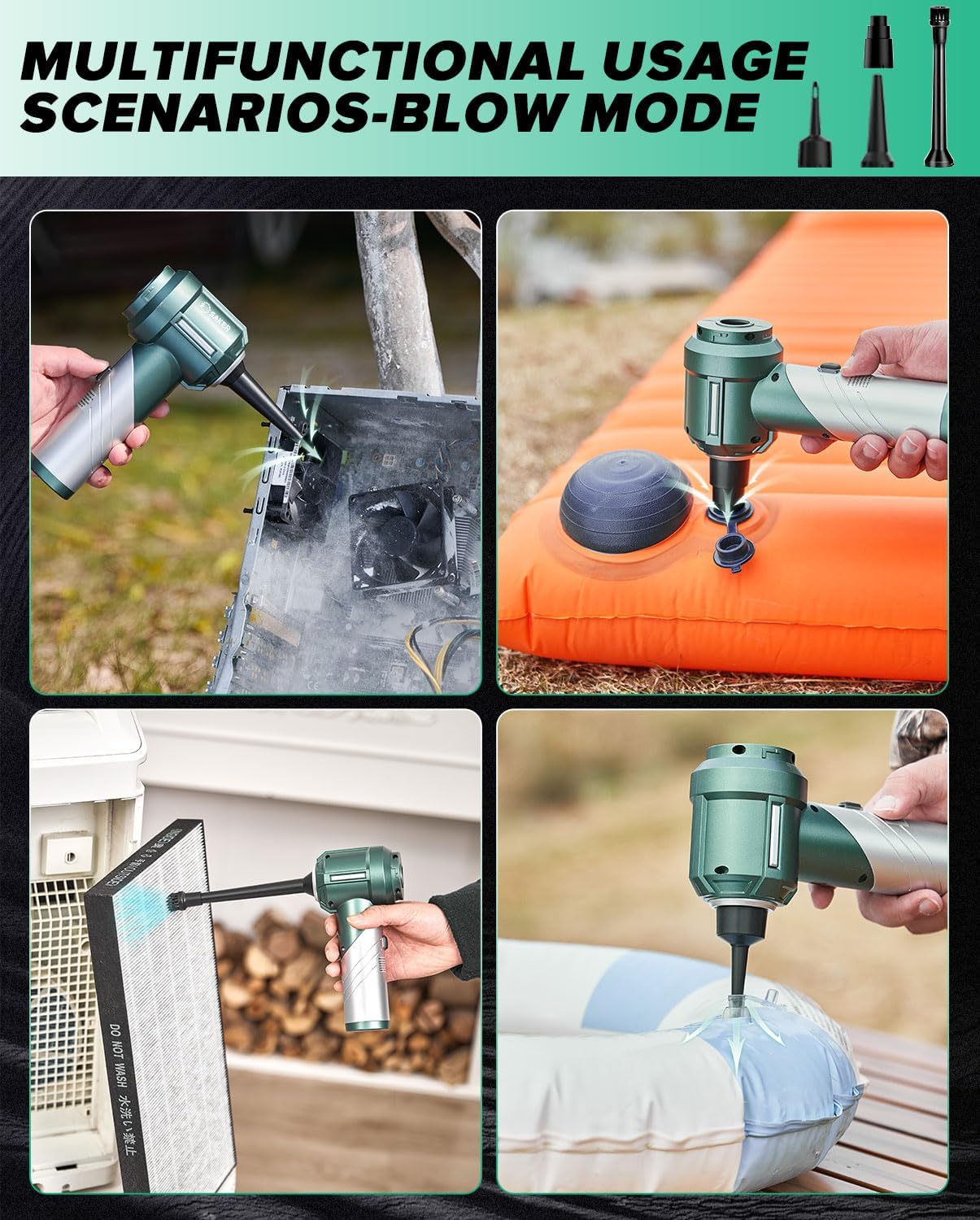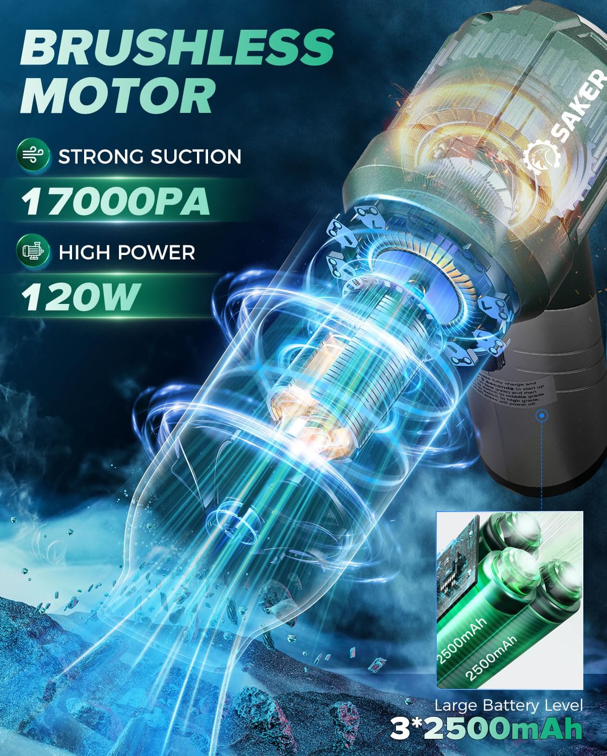 - ă3-in-1 multifunctional mini vacuum cleanerăSaker 3 in 1 Handheld Car Vacuum Cleaner is equipped with various accessories to meet the needs of blowing, sucking, and vacuuming in various scenarios. It can not only blow away garbage and dust from computer keyboards, cars, etc., but also suck up residual garbage or hair from tables, floors, hair, etc. The inflation nozzle can inflate balloons, swimming rings, etc. Rich accessories can make your life more convenient.
