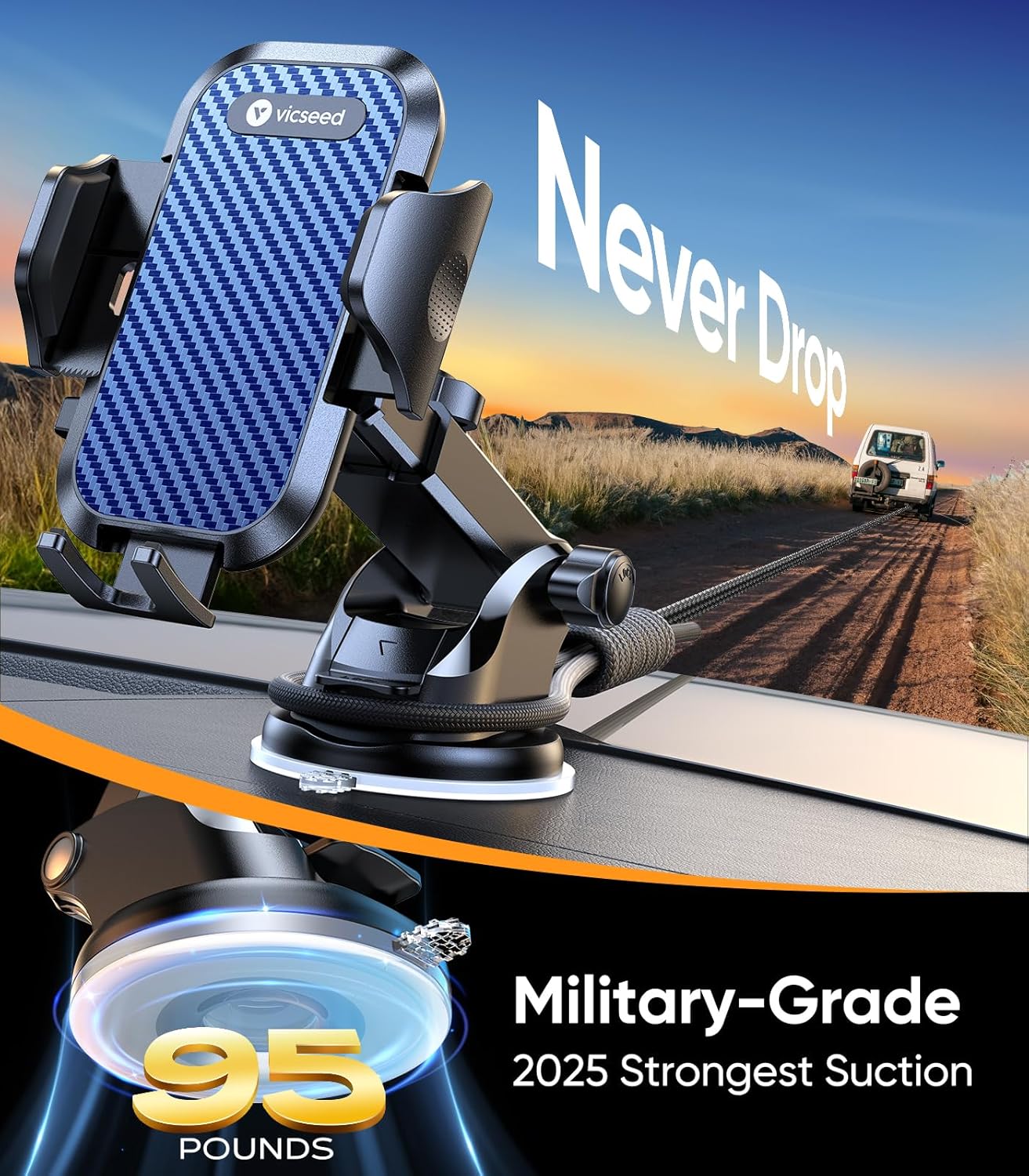 VICSEED Dark Blue Phone Holders for Your Car [Upgraded True Military-Grade Strongest Suction] Cell Phone Mount for Car Dashboard Windshield Vent Truck Boat Stand Adjustable for iPhone Android