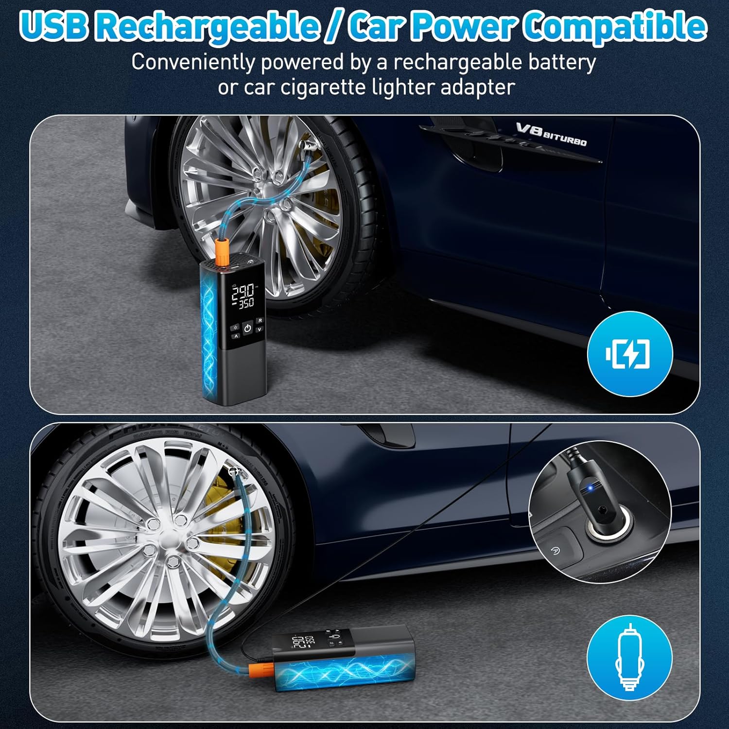 - 【Dual Power Mode – Built-in Battery & 12V Car Plug】Enjoy ultimate flexibility with dual power options—use the built-in rechargeable battery for cordless convenience or plug it into your vehicle’s 12V cigarette lighter socket for continuous power. Perfect for home, travel, and emergency situations.