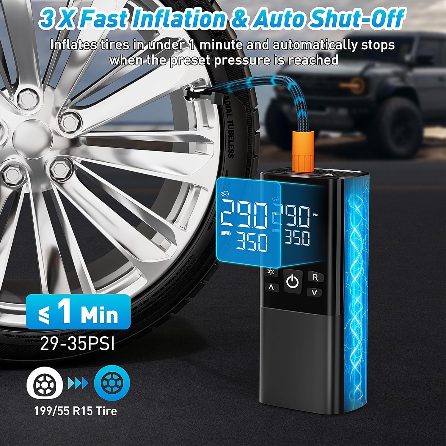 - 【Auto Shut-Off for Accuracy & Safety】Set your desired PSI, and let the inflator do the work! The auto shut-off function prevents over-inflation by stopping the pump once the preset pressure is reached, ensuring optimal tire performance and safety.
