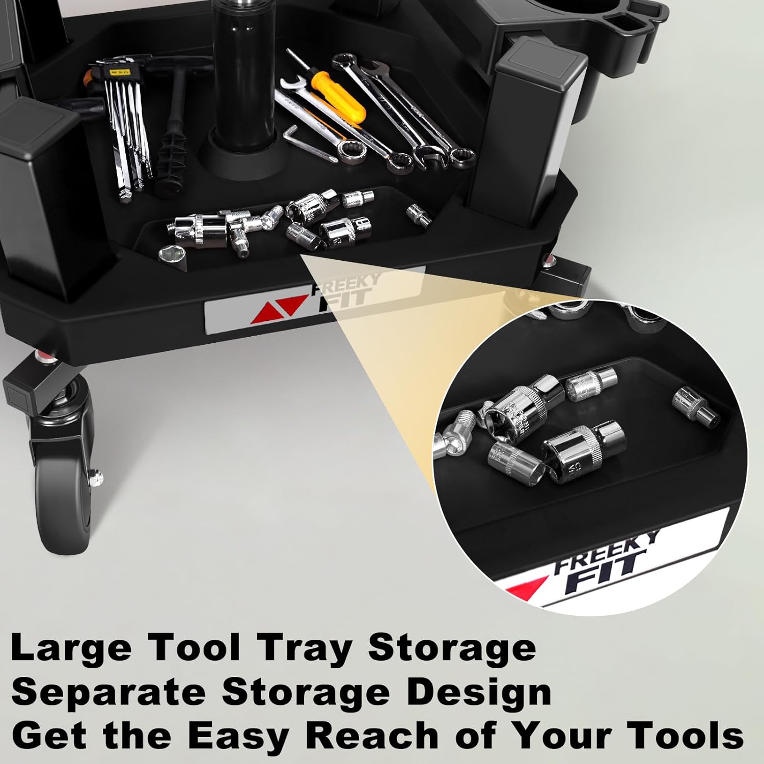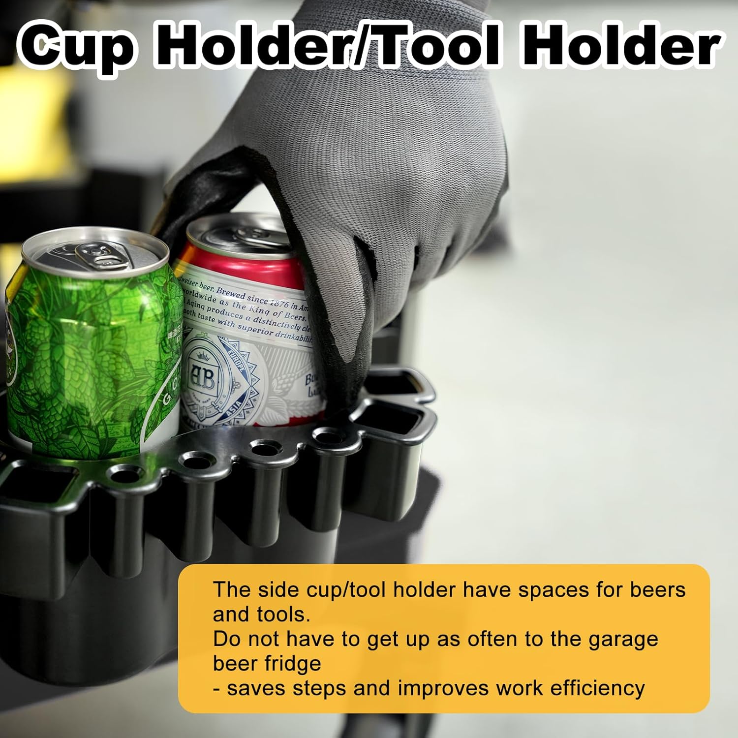 - 【ONE tool tray & TWO cup holders/tool holders】The garage stool has a very good storage function. There is a tool tray and two cup holders/tool holders. At the same time, the tool tray is equipped with a small partition space. You can put small tools like screws here. When you move, do not worry about the screws slipping out of range. It is convenient to store and access necessary tools and parts at anytime