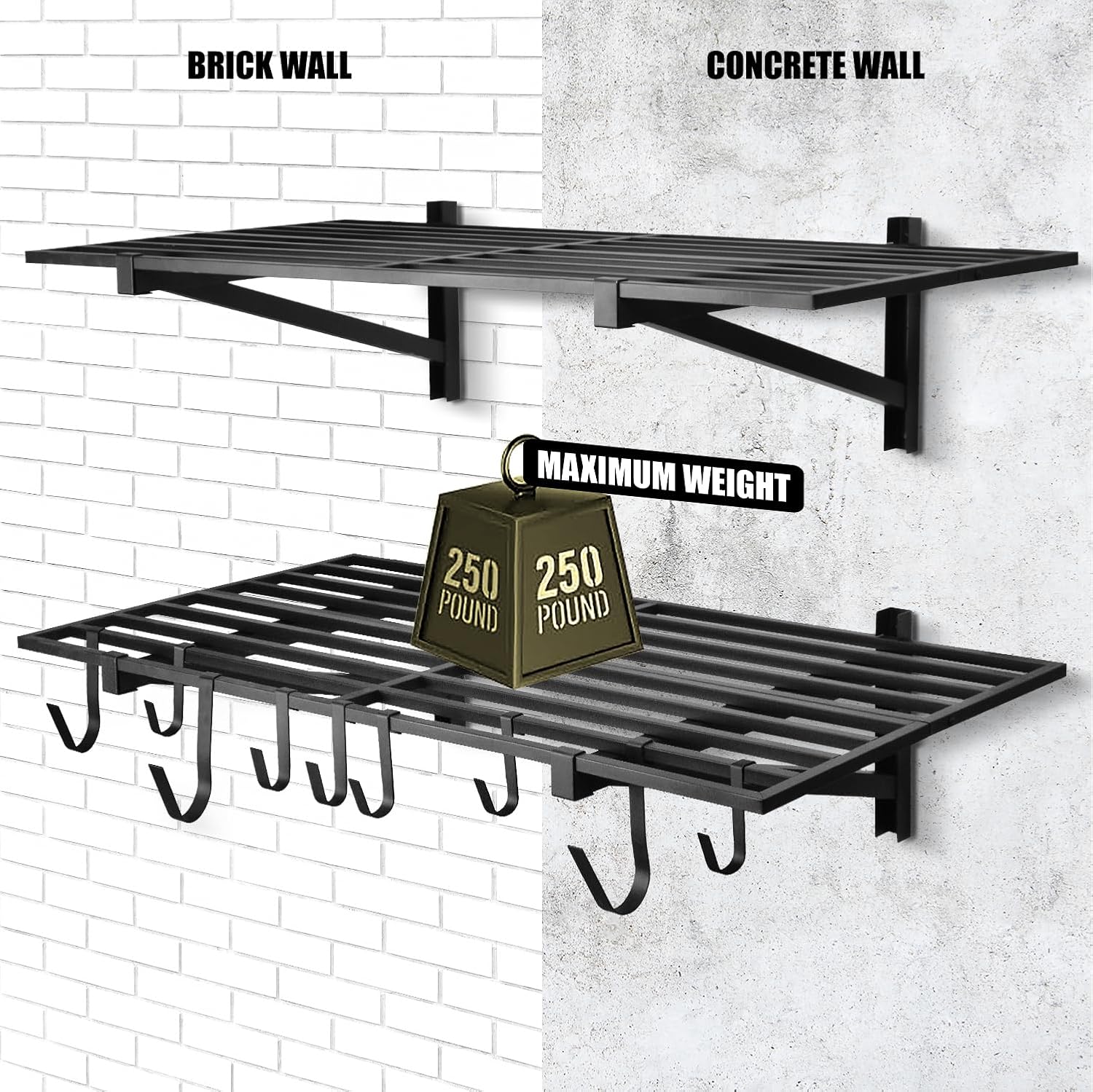 - SAVE SPACE IN THE HOME LOGISTICS: The wall mount rack can help your garage floor clean and tidy, make your garage less crowded, this garage wall shelf also comes with multiple metal hooks, can help you save a lot of space in the garage.
