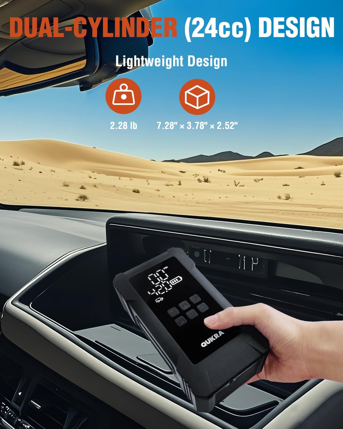 - [Package Include]: Smart portable tire inflator NW08*1, storage bag*1, schrader valve air hose*1, presta valve*1, ball needle*1, type-C charging cable*1, DC cable*1, service manual*1. If you have any questions, we are here to help you, QUIKRA devoted to provide premium product and customer-satisfying service