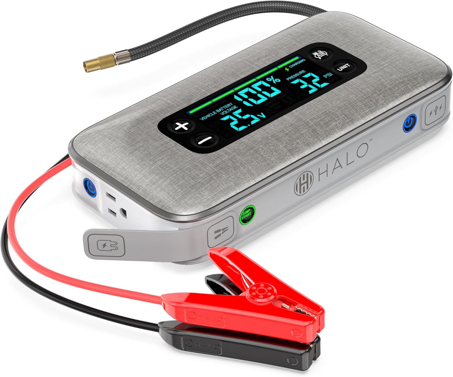 - 4-IN-1 DESIGN (JUMP + INFLATE + CHARGE + ILLUMINATE): The HALO Bolt Ultimate 3.0 offers four products in one. Not only will it jump start your vehicle, but it can inflate your tires, charge USB-powered devices and it has an integrated floodlight, so you’re better prepared for emergency roadside situations or power outages.
